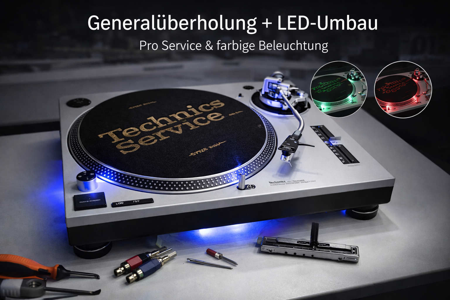 Mit unserem Bundle bekommen Sie ihren Turntable komplett generalüberholt und sauber wieder. Der innovative LED-Umbau ermöglicht es Ihnen eine langlebige Individualität mit hineinzubringen.