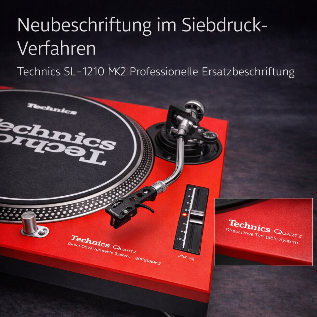 Die Neubeschriftung deines Technics SL-1210 erfolgt im hochwertigen, händischen Siebdruckverfahren mit widerstandsfähiger 2K-Farbe – exakt im originalen Look & Layout.